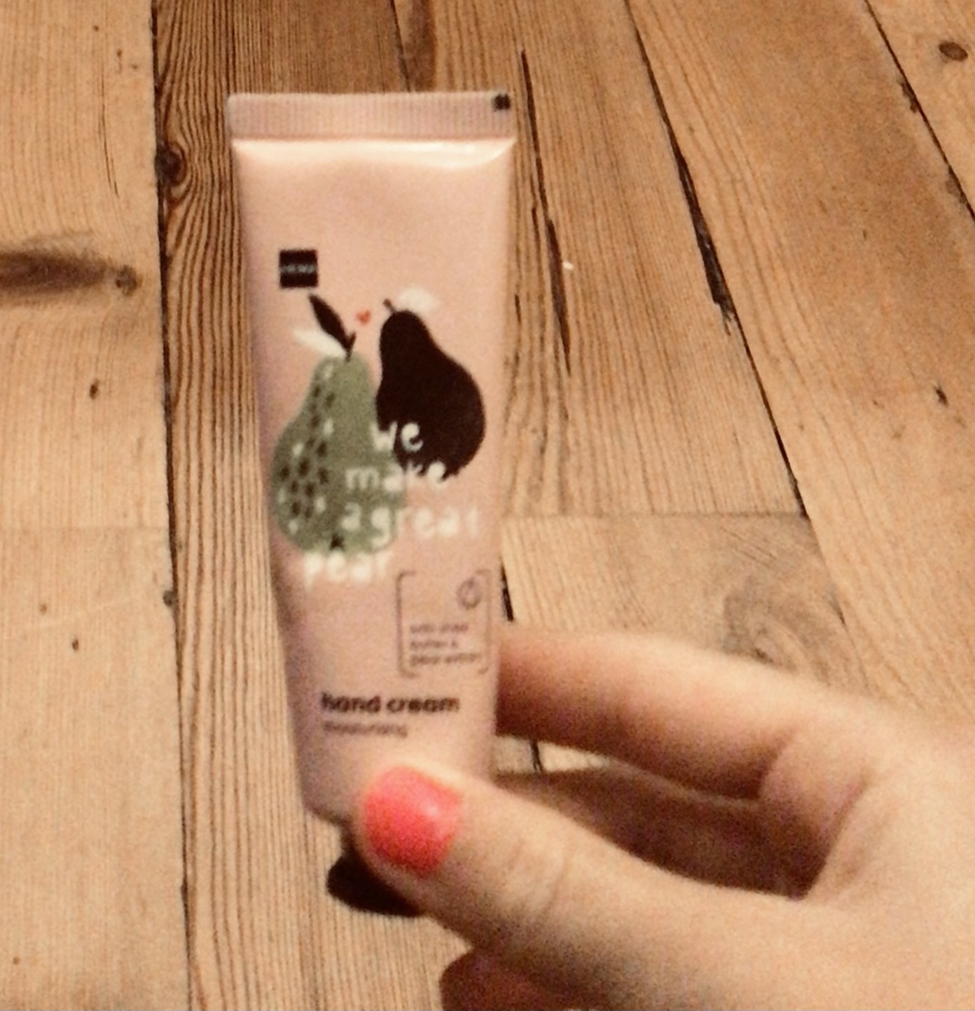 ici, nous avons une crème pour les mains Hema. Elle est parfumé à la poire et elle rend les mains toutes douces. Idéal à avoir toujours sur soi pour combattre le froid !